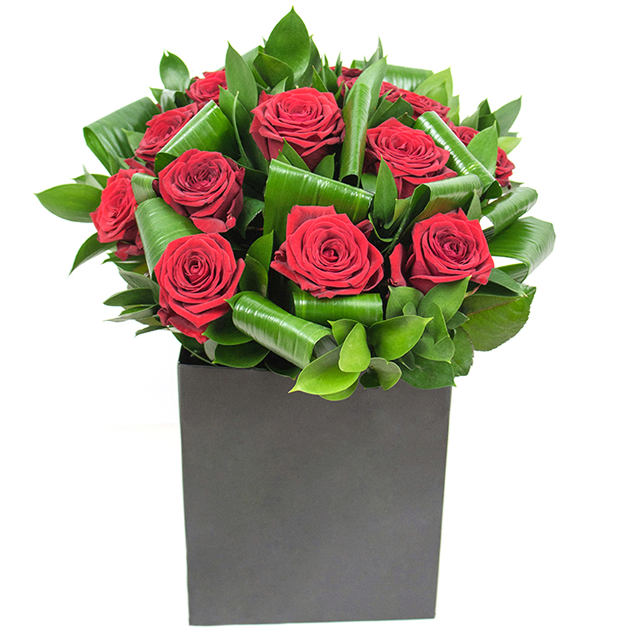 Celebrate life's special moments with our stunning bouquet that artfully blends timeless elegance and vibrant color. Featuring striking red roses harmoniously paired with aspidistra leaves and ruscus, this arrangement is a masterpiece of natural beauty. Every bloom is hand-picked to ensure brilliance and long-lasting freshness.