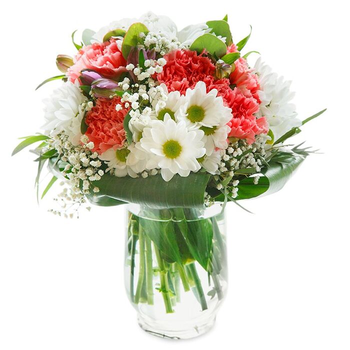 Express your sentiments with our beautiful bouquet, an exquisite combination of soft white and gentle pink blooms. This arrangement includes snow-white chrysanthemums, delicate gypsophila, tender light pink carnations, and vibrant aspidistra leaves, all hand-selected to ensure exceptional freshness and quality.